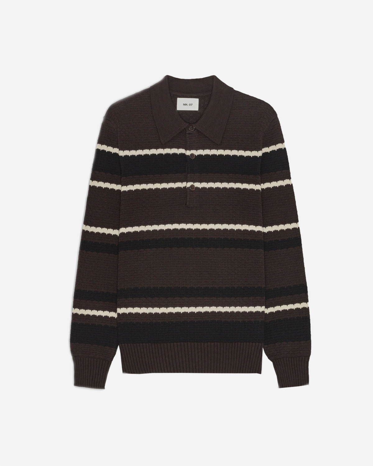 NN07 Alfie LS Polo 60019 - Dusky Port er en stribet, langærmet polo i økologisk bomuld med en blød, let tekstureret overflade. Regular fit gør den behagelig at have på og nem at style både til hverdag og når det skal være lidt pænere. Tone i tone skal-knapper giver en rolig, klassisk finish.