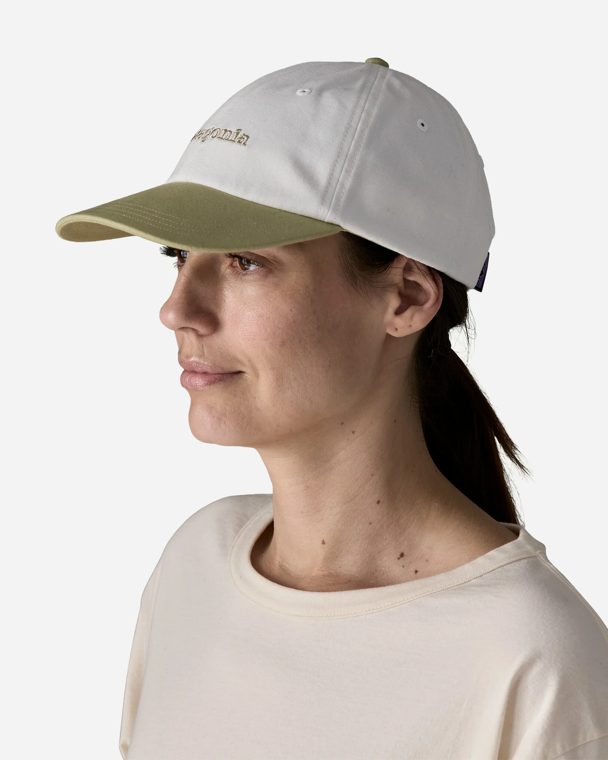 Patagonia Fitz Roy Icon Trad Cap - Text Logo: Birch White w/Gumtree Green giver afslappet komfort og et enkelt look til hverdag, rejser og ture på stien. Den lave, ustrukturerede 6-panel pasform sidder naturligt, og den justerbare stofrem gør det nemt at finde den rette pasform, one size.